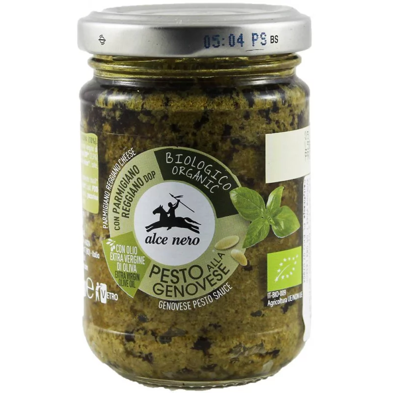 Składniki: bazylia (41%), olej słonecznikowy, oliwa z oliwek extra virgin (10%), orzechy nerkowca, sól, ser parmezan (2,5%), mąka ziemniaczana, cukier trzcinowy, ser pacorino, orzeszki piniowe, czosnek.
