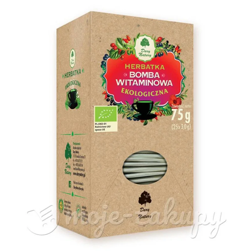 Składniki: owoc róży*(22%), owoc tarniny*, jabłka, owoc berberysu*, owoc bzu, owoc jarzębiny*, owoc czarnej porzeczki*, owoc maliny*, owoc głogu* oraz burak ćwikłowy* i płatki róży*( w róznych proporcjach)