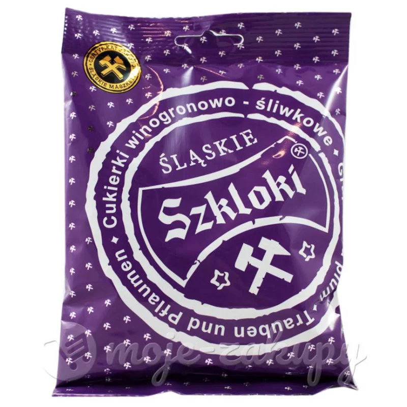 Składniki: cukier syrop glukozowy, kwas cytrynowy, zagęszczony sok z czerwonych winogron 0,55%, zagęszczony sok śliwkowy 0,25%, aromaty, barwniki: czerwień buraczana, indygotyna.