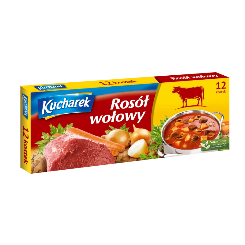 Składniki: sól, tłuszcz palmowy częściowo utwardzony, skrobia, wzmacniacze smaku: glutaminian monosodowy, 5'-rybonukleotydy disodowe, olej rzepakowy, cukier, barwnik: karmel amoniakalny, aromat, warzywa suszone (0,7%): marchew, natka pietruszki, cebula, regulator kwasowości: kwas cytrynowy, suszone mięso wołowe (0,1%)