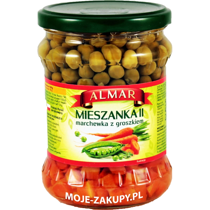 Składniki: marchew (35%), groch mrożony (25%), woda i sól