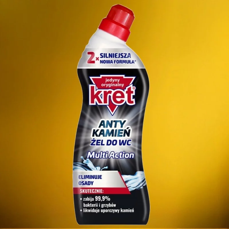 Nie zostawiaj szansy zabrudzeniom! KRET Multi Action to silnie działający żel do WC, który skutecznie usuwa kamień, osad i bakterie, pozostawiając toaletę lśniącą i świeżą.