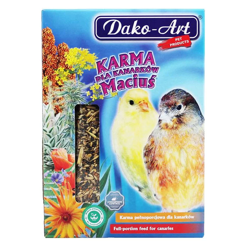 Karma pełnoporcjowa dla kanarków. Mieszanka paszowa. Skład (ziarna zbóż - 58,6%) kanar, murzynek, owsik, proso, proso czerwone, (nasiona oleiste - 41,4%) konopie, len, rzepak, rzepik. Sposób stosowania: Karmę podawać w małych dawkach dwa - trzy razy dziennie. Pakowane w atmosferze ochronnej.