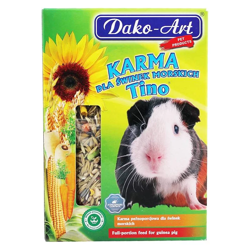 Pełnoporcjowa karma dla świnek morskich. Mieszanka paszowa. Skład (ziarna zbóż - 93,1% pszenica, ekstruder- kukurydziany, granulaty, kukurydza, owies, (nasiona oleiste - 3,2%) słonecznik, (susze - 2,8%) marchwi i pasternaku, (wyroby piekarnicze zabarwione - 0,9%) paluszki, biszkopt mielony zabarwiony. Sposób stosowania: Karmę podawać w małych dawkach dwa - trzy razy dziennie. pakowane w atmosferze ochronnej.