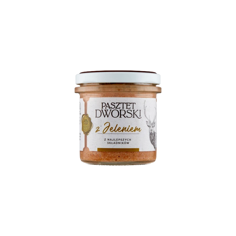 Pasztet wieprzowo-drobiowy z mięsem z jelenia. Produkt sterylizowany.