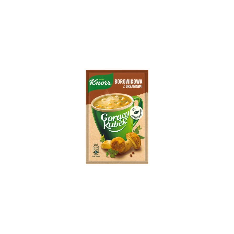 Knorr Gorący Kubek Borowikowa z grzankami to idealne rozwiązanie na szybki i smaczny posiłek w ciągu dnia. Ta klasyczna zupa błyskawiczna łączy w sobie głęboki, szlachetny aromat borowików z wyjątkową chrupkością złocistych grzanek. Wystarczy zalać wrzątkiem, zamieszać i po minucie cieszyć się rozgrzewającym smakiem ulubionej zupy, gdziekolwiek jesteś – w domu, w biurze czy w podróży. Bez dodatku barwników, za to z pełnią grzybowego charakteru.