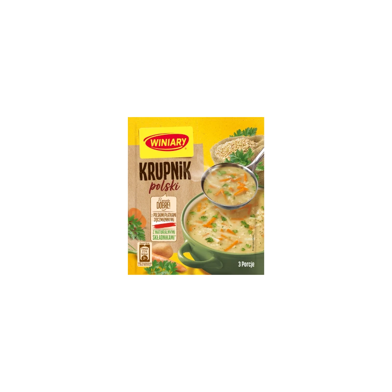 Krupnik to tradycyjna zupa, której smak łączy pokolenia i przywołuje wspomnienia z dzieciństwa. Charakteryzuje go wyjątkowy aromat i sycąca konsystencja, która sprawia, że jest idealnym daniem na chłodniejsze dni. Krupnik polski WINIARY wyróżnia się głębokim smakiem, który zawdzięcza polskim płatkom jęczmiennym, suszonym warzywom i odpowiednio dobranym przyprawom. Znajdziesz w nim ziemniaki, marchew, seler, pietruszkę, cebulę, czosnek oraz suszone podgrzybki, które na pewno doskonale znasz ze swojej kuchni.