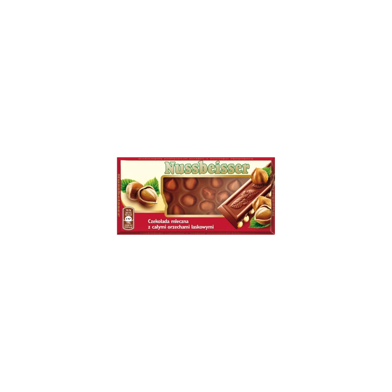 Czekolada mleczna z całymi orzechami laskowymi - chrupiące, intensywne i przepyszne połączenie. Wyjątkowy smak, który czeka na Ciebie. Każdy kawałek czekolady Nussbeisser wypełniają po brzegi całe orzechy. Nie czekaj, przełam tabliczkę po swojemu i daj się porwać chrupiącym doznaniom. Nussbeisser - czekolada z okienkiem. Okienko na porywający smak. Otwórz sie na wyjatkowe orzechowo-czekoladowe połączenie. Chwile z czekoladą Nussbeisser to pełnia smaku w każdym kawałku.