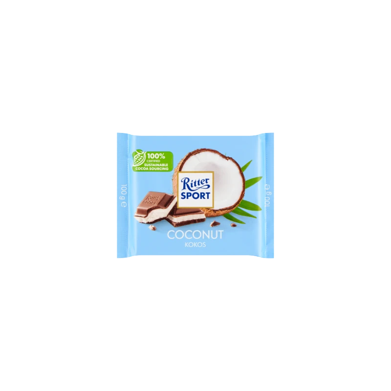 Przenieś się do egzotycznego raju z Ritter Sport Mleczna z Kremem Kokosowym (100g). Ta kwadratowa tabliczka to połączenie aksamitnej czekolady mlecznej z delikatnym, słodkim kremem kokosowym i chrupiącymi wiórkami kokosowymi. Idealna propozycja dla miłośników tropikalnych smaków, którzy szukają chwili relaksu.