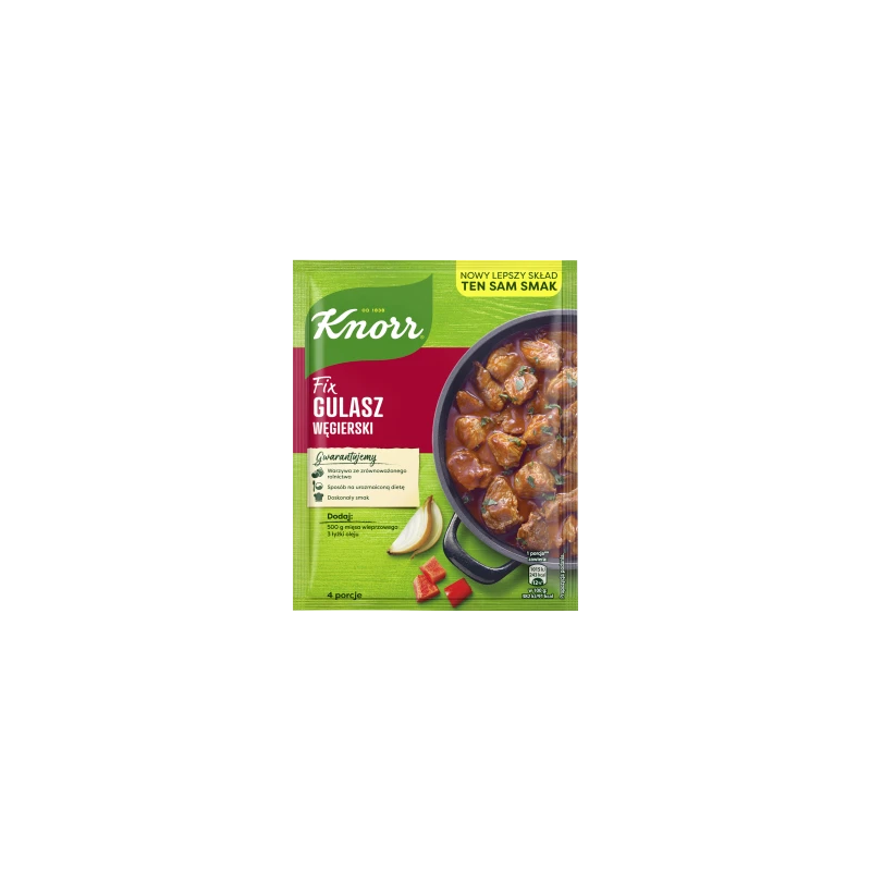 Składniki: skrobia, papryka (11,8 %), cebula¹ (11,1 %), cukier, sól jodowana, ziemniaki, koncentrat pomidorowy¹ (9,1 %), aromaty, sól, olej kukurydziany, czosnek¹ (1,2 %), majeranek (0,6 %), sok z cytryny, kminek, pieprz, pieprz cayenne (chili), ziele angielskie, ekstrakt drożdżowy, korzeń pietruszki¹, ¹Uprawiane w sposób zrównoważony.