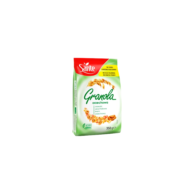 Sante Granola orzechowa to wyjątkowo chrupiące, niemal ciasteczkowe połączenie wypiekanych pełnoziarnistych płatków owsianych (38,8 % składu) z dodatkiem orzeszków arachidowych i kremu orzechowego. Granola orzechowa jest naturalnym źródłem tiaminy i niacyny oraz składników mineralnych: potasu, fosforu, magnezu, żelaza, cynku i manganu. Charakteryzuje się wysoką zawartością błonnika pokarmowego.