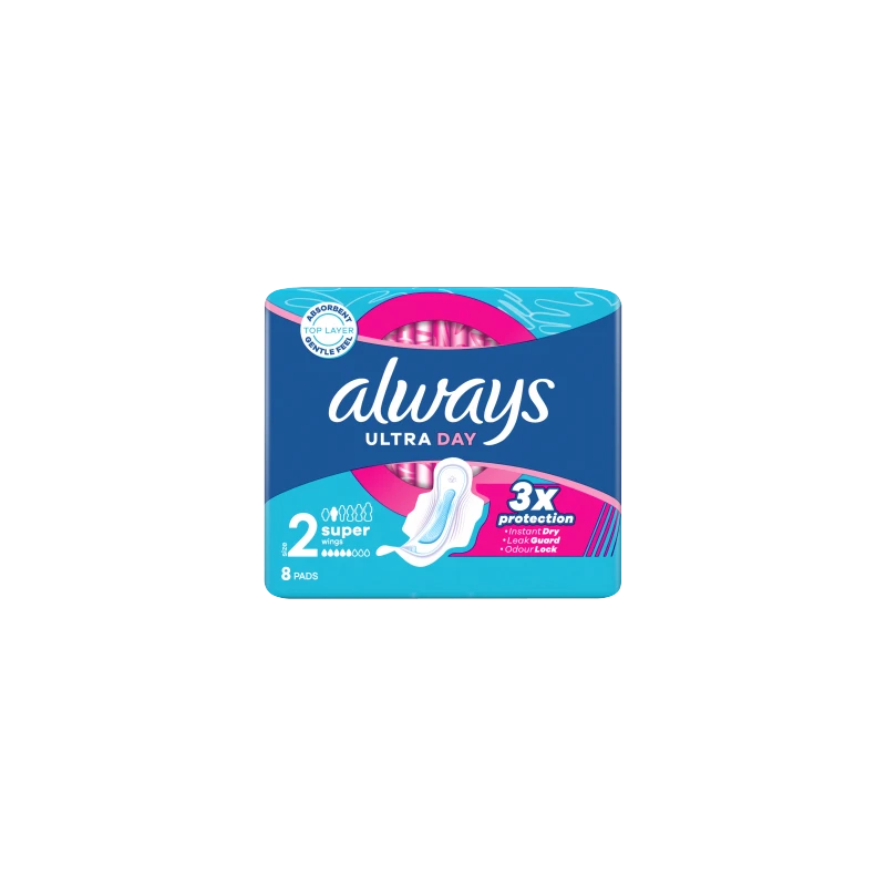 Wybierz odpowiednie rozwiązanie dla siebie, takie jak potrójna ochrona, którą zapewniają podpaski ALWAYS Ultra Day Super (rozmiar 2) ze skrzydełkami. Podpaski Always z chłonną i delikatną powłoczką wchłaniają wilgoć w kilka sekund dzięki technologii InstantDry, a za sprawą technologii LeakGuard i OdorLock zapobiegają przeciekaniu i nieprzyjemnemu zapachowi. Wyjątkowe skrzydełka ComfortLock zaprojektowano tak, by zapewnić doskonałe dopasowanie do każdego rodzaju bielizny. Dla dodatkowej ochrony w nocy wypróbuj podpaski Always Night w różnych rozmiarach. Podpaski Always zostały zatwierdzone dermatologicznie przez Skin Health Alliance.
