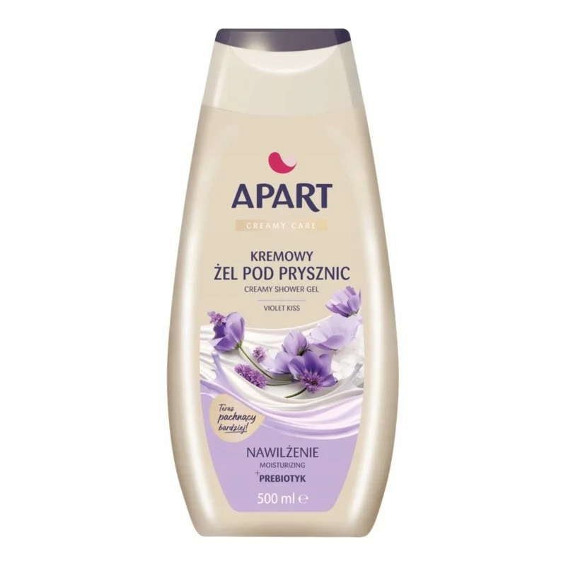 Cechy produktu: Damski żel pod prysznic, pojemność 500 ml, ekstrakt z fiołka (Violet Kiss), naturalne prebiotyki, 91% składników naturalnych, formuła wegańska, łagodny dla mikrobiomu, pH przyjazne dla skóry, zapach kwiatowy, nawilżający żel kremowy, testowany dermatologicznie, kosmetyki Apart dla kobiet.