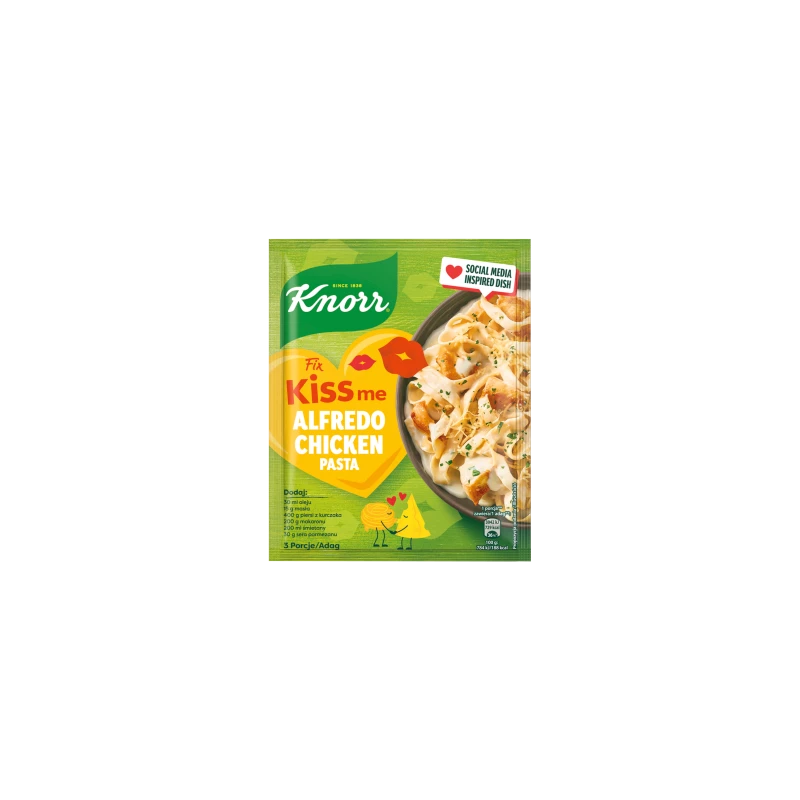Knorr Fix Kiss Me Alfredo Chicken 42 g to profesjonalna kompozycja z trzema rodzajami serów, która pozwala w kilka minut przygotować kremowy, aksamitny sos Alfredo do kurczaka i makaronu w domowym zaciszu.