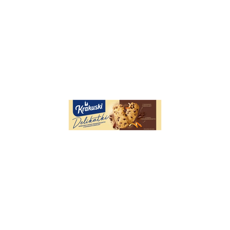 Odkryj harmonię smaków! Krakuski Delikatki w tej odsłonie to kunsztowne połączenie kruchego herbatnika, aromatycznego ekstraktu z pomarańczy oraz chrupiących kawałków prawdziwej czekolady. To idealna propozycja dla osób, które szukają w słodyczach czegoś więcej niż tylko cukru – szukają szlachetnego i wyrazistego aromatu.