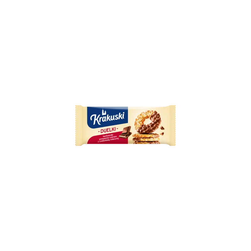 Nie musisz już wybierać! Krakuski Duelki to innowacyjne podejście do klasycznego herbatnika. Z jednej strony poczujesz chrupkość złocistego ciastka oprószonego grubymi kryształkami cukru, z drugiej – odkryjesz warstwę rozpływającej się w ustach, oryginalnej czekolady mlecznej. To duet idealny, stworzony dla tych, którzy szukają bogactwa tekstur i smaków w jednym ciasteczku.