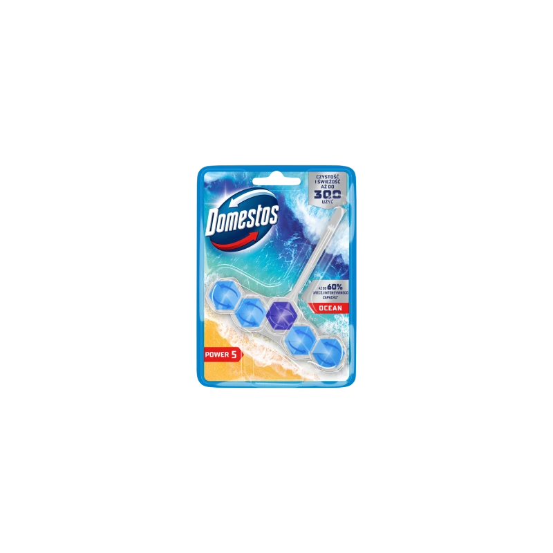 Zadbaj o higieniczną czystość swojej łazienki z niezawodną kostką Domestos Power 5 Ocean. Ta zaawansowana zawieszka to połączenie intensywnego, morskiego aromatu z potężną formułą czyszczącą, która dba o Twoją toaletę przy każdym spłukaniu. System 5 w 1 zapewnia kompleksową pielęgnację muszli, oszczędzając Twój czas na codzienne sprzątanie.