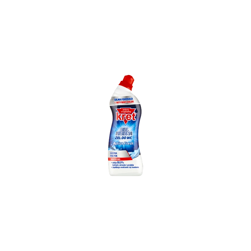Kret Biel i Higiena Active Fresh (750 g) to zaawansowany żel do WC o działaniu wybielającym, stworzony do kompleksowego dbania o estetykę i bezpieczeństwo Twojej toalety. Dzięki zawartości aktywnych związków wybielających, produkt błyskawicznie radzi sobie z ciemnymi osadami, zaciekami oraz przebarwieniami, przywracając muszli idealną biel.