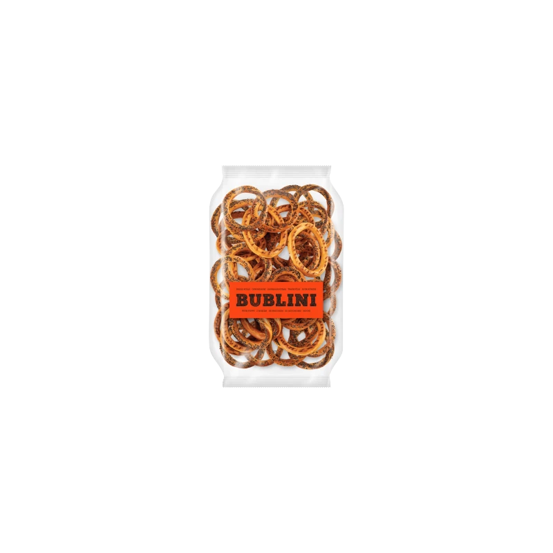 Bublini Obwarzanki z makiem (375 g) to chrupiąca, pszenna przekąska, która nawiązuje do najlepszych tradycji piekarniczych. Złociste, kruche krążki zostały obficie posypane niebieskim makiem, co nadaje im nie tylko estetyczny wygląd, ale przede wszystkim unikalny, lekko orzechowy profil smakowy.