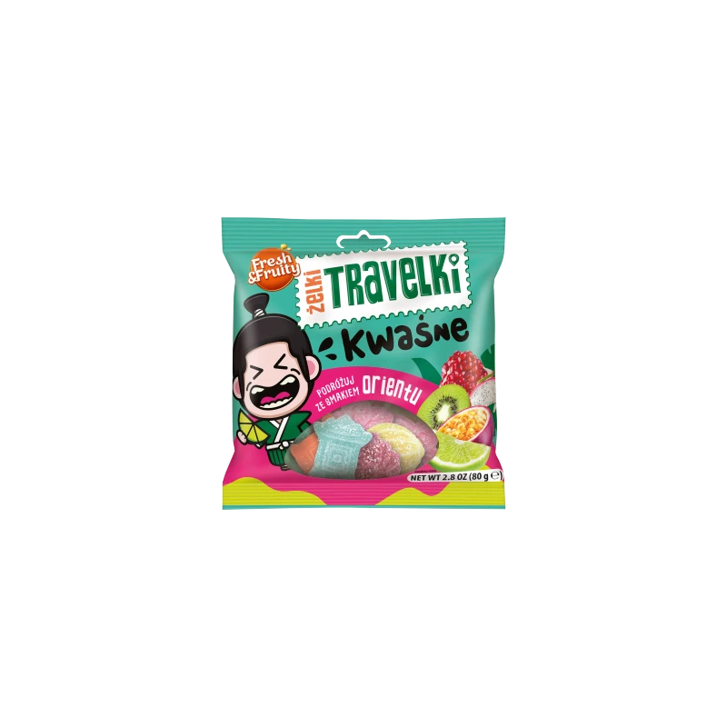 Kolejna porcja egzotyki w wydaniu Travelków – tym razem w wersji kwaśnej, która charakteryzuje się orzeźwiającą posypką i intensywnymi smakami owocowymi.