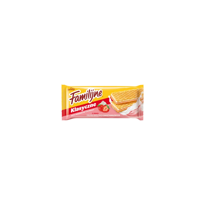 Wafle Familijne Klasyczne to kultowa przekąska, która od lat gości na polskich stołach. Wariant truskawkowo-śmietankowy to idealna propozycja dla miłośników owocowych smaków połączonych z aksamitną, mleczną nutą. Każdy wafel składa się z wyjątkowo chrupkich, złocistych płatów, które skrywają w sobie dwukolorowe nadzienie.
