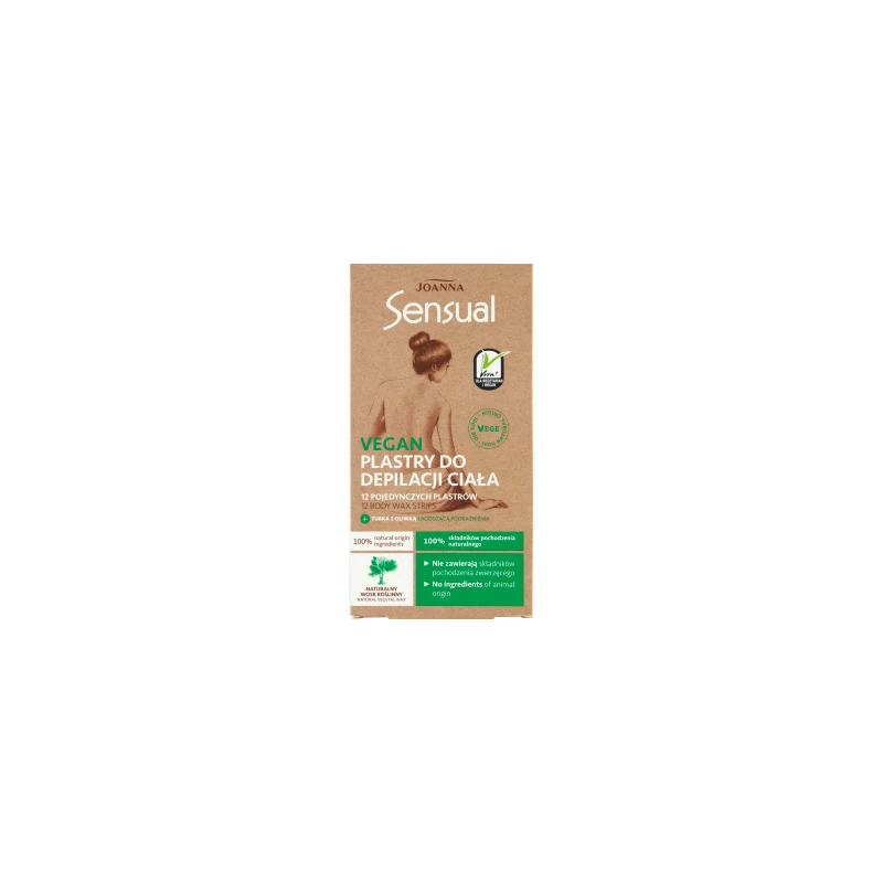 Joanna Sensual Vegan to linia stworzona dla osób poszukujących skutecznych rozwiązań w depilacji, opartych na składnikach pochodzenia roślinnego. Zestaw zawiera 12 elastycznych plastrów, które idealnie dopasowują się do kształtu ciała, oraz tubkę z łagodzącą oliwką, która dba o skórę tuż po depilacji.