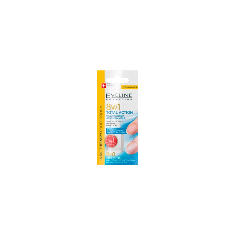Eveline Nail Therapy Professional 8w1 to rewolucyjna odżywka do paznokci, która rozwiązuje aż 8 problemów płytki w jednej kuracji. Dzięki unikalnej recepturze, produkt wnika głęboko w strukturę paznokcia, maksymalnie go utwardzając i uszczelniając.