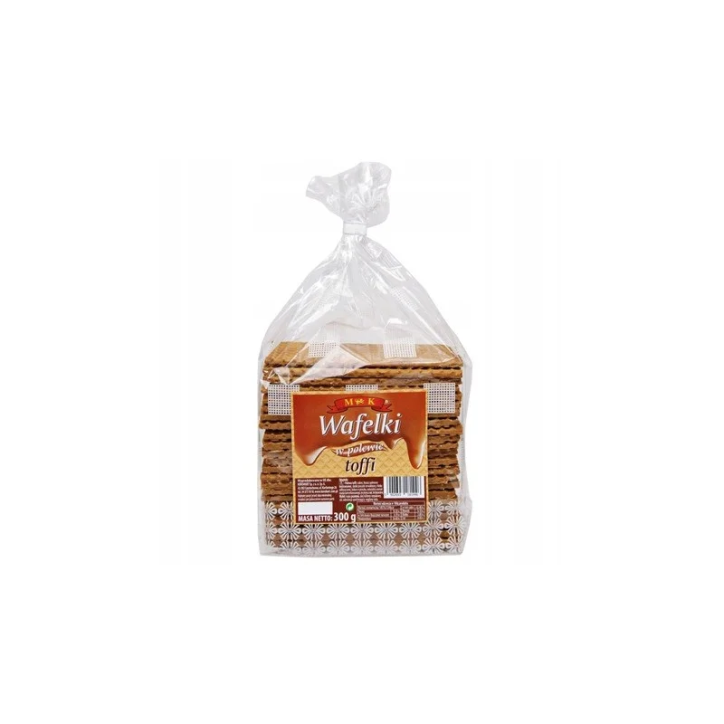 MK Wafelki w polewie toffi 300 g to wyjątkowo chrupiąca i delikatna przekąska, która zachwyca aksamitnym wykończeniem o smaku słodkiego karmelu. Cienkie, pszenne listki waflowe zostały starannie oblane gładką polewą toffi, stworzoną na bazie beztransowego tłuszczu palmowego oraz naturalnych aromatów. To idealne połączenie kruchej struktury z głęboką, maślaną słodyczą, która doskonale komponuje się z filiżanką gorącej kawy lub herbaty. Dzięki dużemu opakowaniu 300 g, wafelki MK są świetnym wyborem na rodzinne spotkania, poczęstunek dla gości czy słodki zapas do pracy i szkoły. Odkryj wyjątkową lekkość i karmelowy aromat w każdym chrupiącym kęsie.