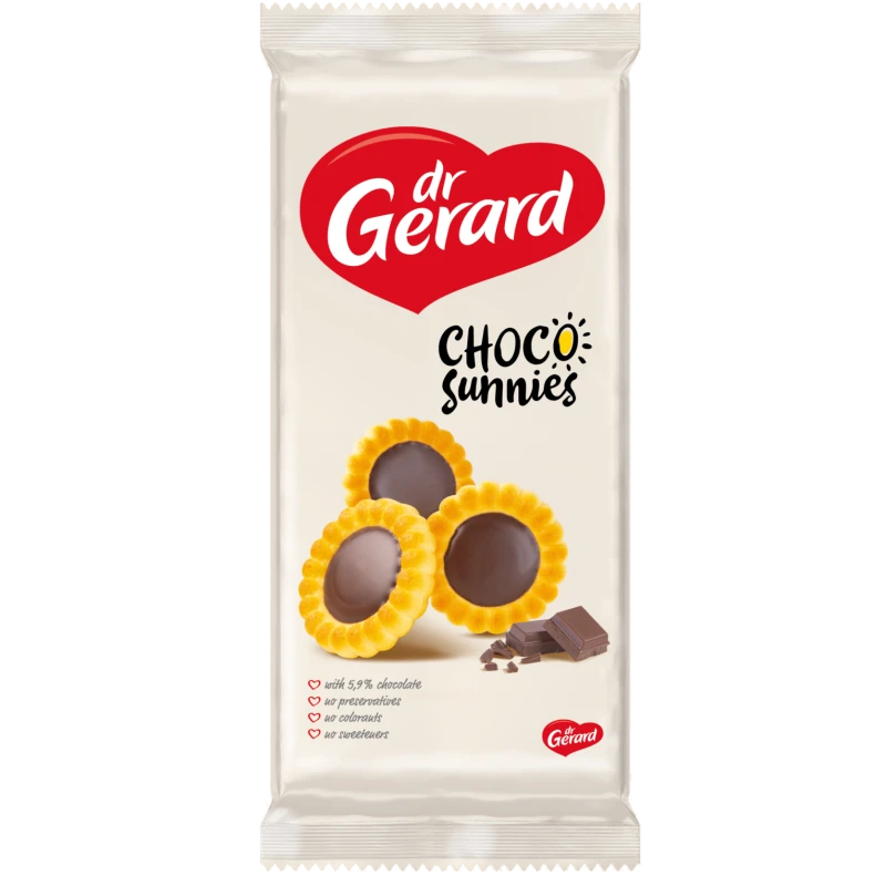 dr Gerard Choco Sunnies 150 g to radosne i pyszne ciasteczka, które rozchmurzą każdy dzień. Te chrupiące, okrągłe herbatniki z charakterystycznym wzorem "słoneczka" skrywają w swoim wnętrzu aksamitny, gęsty krem o smaku czekoladowym. Idealne połączenie kruchego ciasta z intensywnie kakaowym nadzieniem sprawia, że Choco Sunnies są uwielbiane zarówno przez dzieci, jak i dorosłych. Dzięki poręcznemu opakowaniu 150 g, ciasteczka świetnie sprawdzą się jako słodki dodatek do drugiego śniadania, przekąska na spacerze lub pyszny poczęstunek do szklanki zimnego mleka czy popołudniowej herbaty. Poczuj słońce w każdym kęsie z wyjątkowymi herbatnikami od dr Gerarda.