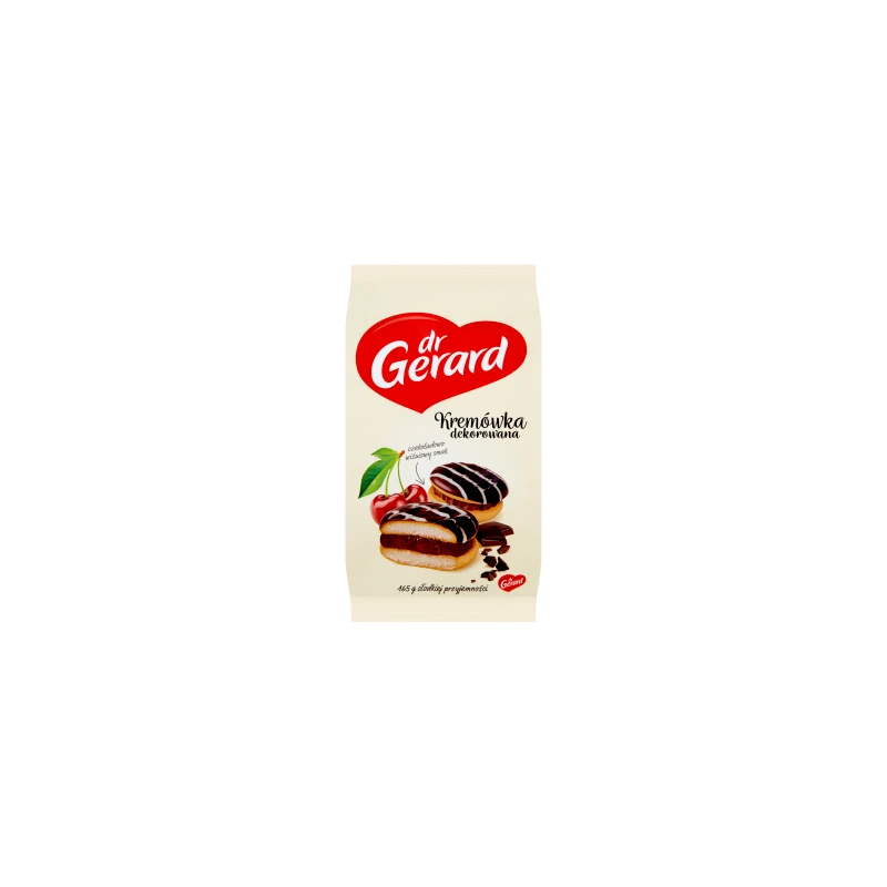 dr Gerard Kremówka dekorowana 165 g o smaku czekoladowo-wiśniowym to propozycja dla osób szukających słodyczy o bogatym profilu smakowym. Kruchy, złocisty herbatnik stanowi bazę dla aksamitnego, puszystego kremu, który łączy w sobie głębię kakao oraz orzeźwiającą, lekko kwaskowatą nutę wiśni. Wyjątkowy charakter ciastek podkreśla delikatna dekoracja z ciemnej polewy, tworząca apetyczny wzór na powierzchni. Kremówki dr Gerard to doskonały wybór do popołudniowej kawy lub herbaty, łączący w sobie tradycyjną chrupkość z nowoczesnym, owocowo-czekoladowym nadzieniem. Dzięki poręcznemu opakowaniu z tacką, ciastka zachowują swoją świeżość i nienaganny wygląd.