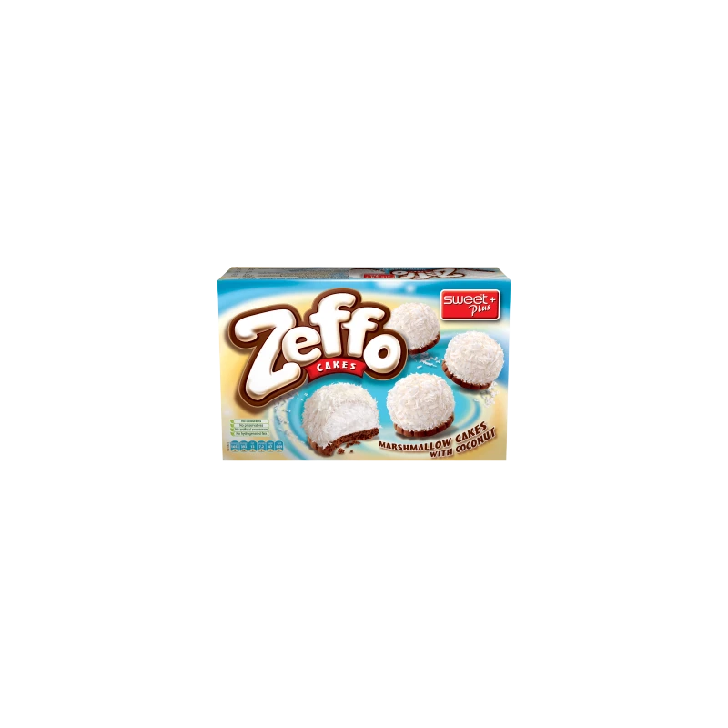 Zeffo to lekkie łakocie, które składają się z kruchego kakaowego ciastka połączonego z miękką waniliową pianką marshmallow o smaku waniliowym w posypce kokosowej.
