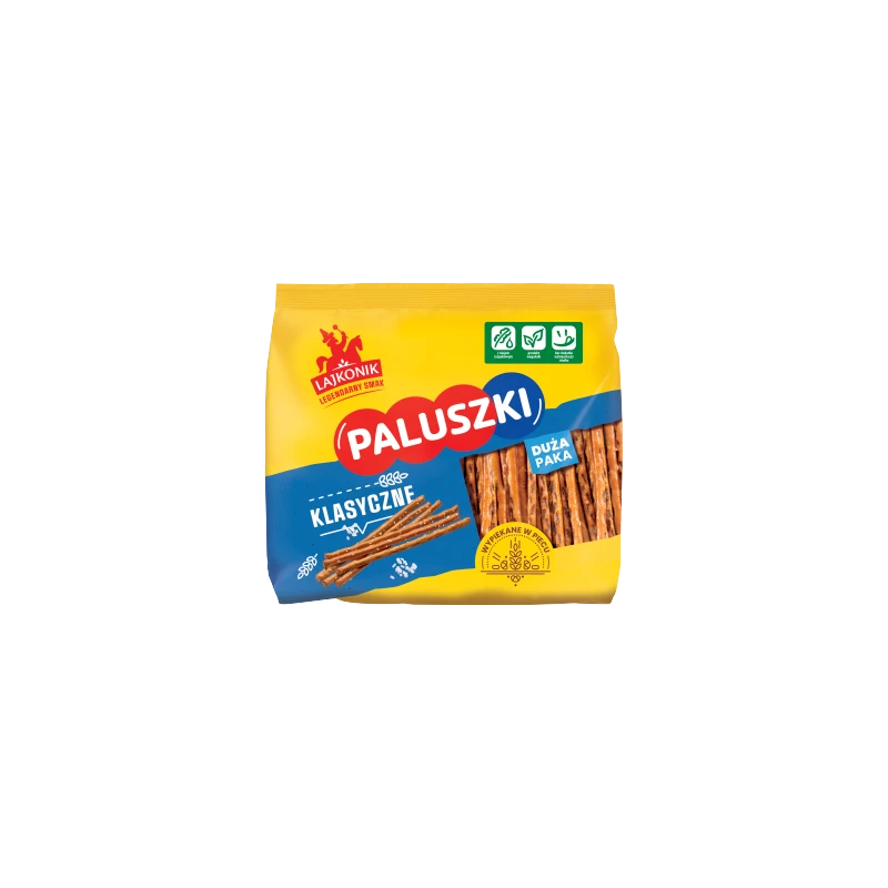 Niekwestionowany król każdej domówki! Lajkonik Paluszki klasyczne to produkt, którego nie trzeba przedstawiać. Od lat powstają według tej samej, starannie strzeżonej receptury, która gwarantuje im niepowtarzalny smak, złocisty kolor i charakterystyczną, lśniącą skórkę.