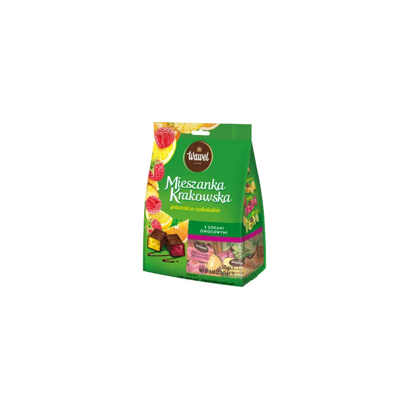 Odkryj prawdziwą owocową radość zamkniętą w szlachetnej czekoladzie! Mieszanka Krakowska z Wawelu to zestaw kultowych galaretek w czterech orzeźwiających smakach: soczystej maliny, dojrzałej pomarańczy, egzotycznego ananasa i świeżej cytryny. To klasyka polskich słodyczy, która od lat łączy pokolenia swoim niezmiennym smakiem i najwyższą jakością.