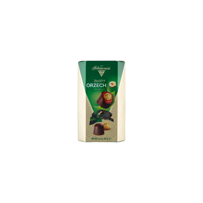 Odkryj głębię orzechowej przyjemności! Złoty Orzech od Solidarności to luksusowe praliny stworzone dla prawdziwych koneserów. Każda czekoladka kryje w sobie chrupiący, cały orzech laskowy zatopiony w aksamitnym kremie orzechowym, a całość została zamknięta w skorupce z najwyższej jakości czekolady. To harmonijne połączenie tekstur i smaków, które zachwyca od pierwszego kęsa.