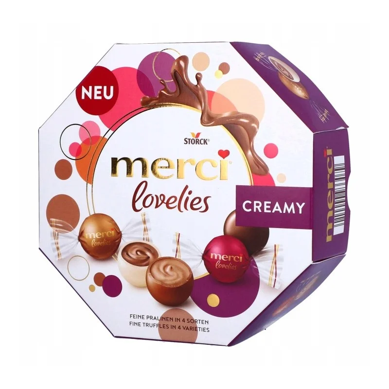 Odkryj najbardziej kremowe oblicze Merci z zestawem Merci Lovelies Creamy. To wyjątkowa bombonierka zawierająca selekcję pralin, które zachwycają delikatną teksturą i szlachetnym smakiem. Każda kuleczka jest starannie zapakowana, co czyni je idealnym wyborem na elegancki poczęstunek do kawy lub luksusowy upominek.