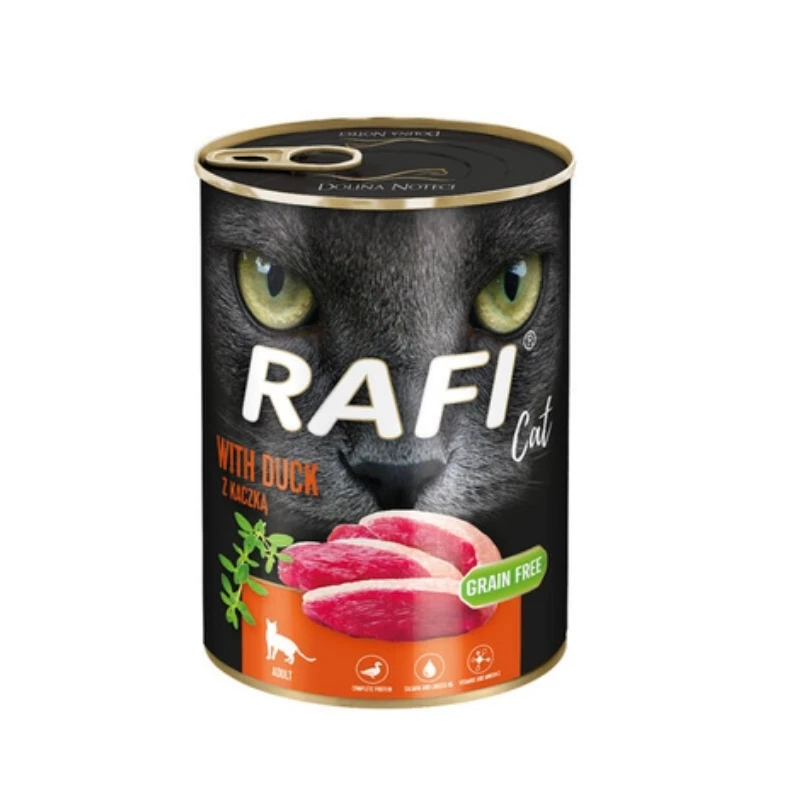 Rafi Cat Adult z kaczką to pełnowartościowa mokra karma dla dorosłych kotów, oferująca wyśmienity smak i wysokiej jakości białko z kaczki w poręcznej porcji 400 g.