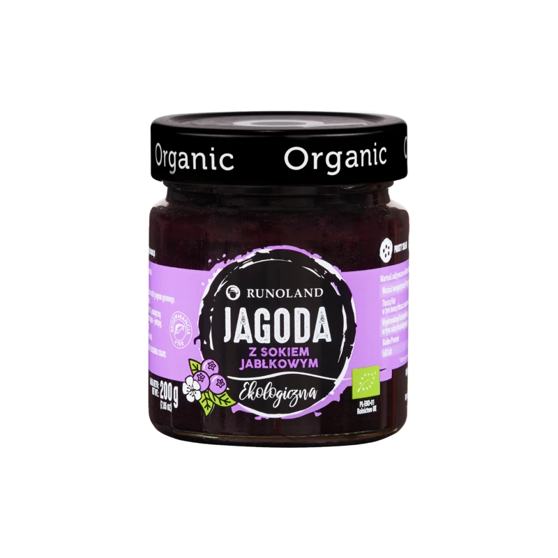 jagoda czarna* (Vaccinium myrtillus) (60 %), zagęszczony sok jabłkowy* (33 %), woda, substancja zagęszczająca: pektyny. (*certyfikowany składnik ekologiczny)