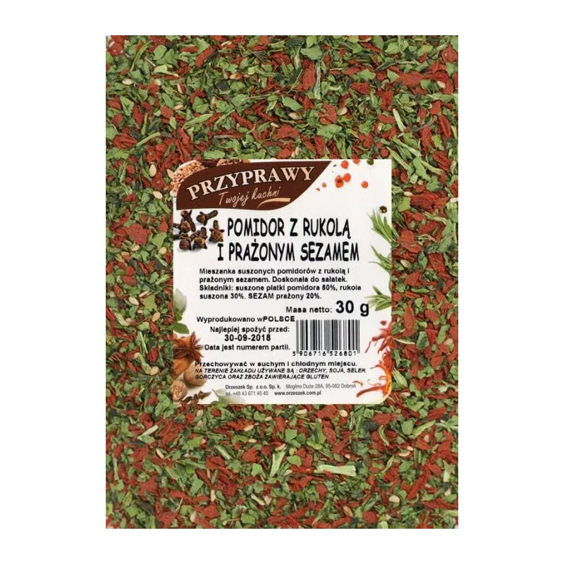 Składniki: suszone pomidory 50%, sezam prażony 30%, rukola suszona 20%.