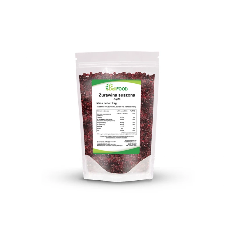 Naturalna żurawina suszona, starannie cięta – gotowa do spożycia bez konieczności obróbki. Bez konserwantów