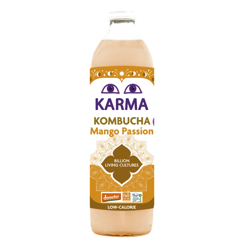 Karma Kombucha to w 100% organiczny, naturalnie gazowany napój, który powstaje w wyniku fermentacji herbaty zielonej z dodatkiem cukru trzcinowego i kultury kombuchy. W wersji z mango, 95% napoju stanowi kombucha, a 5% to sok z mango.