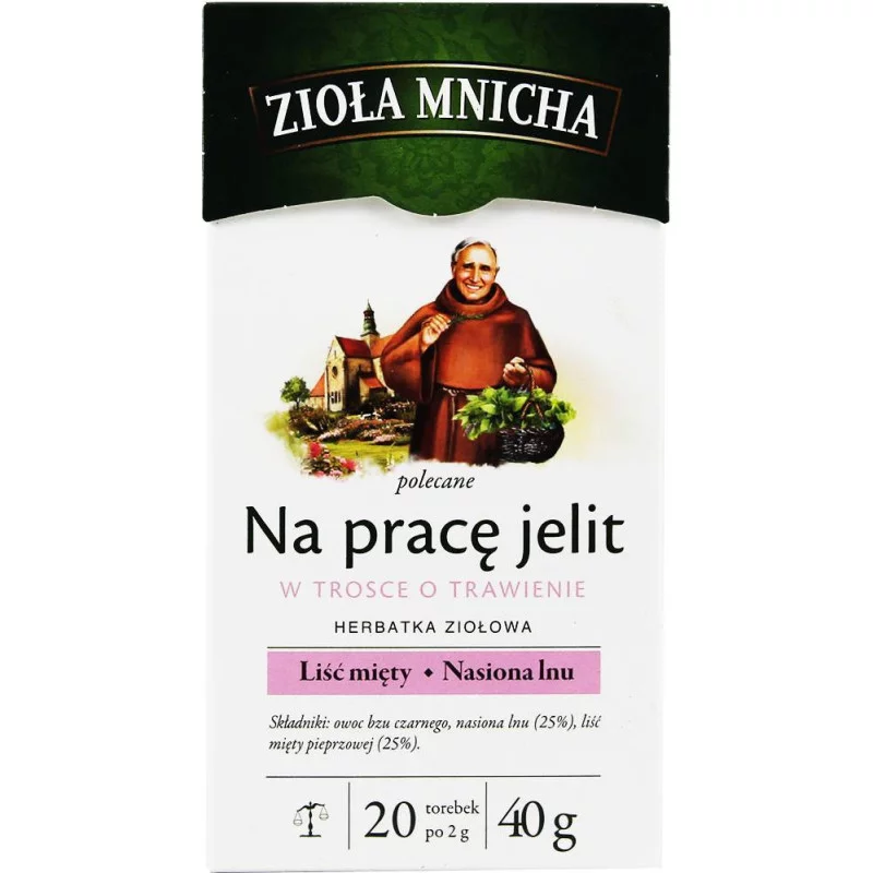 Linia Zioła Mnicha stworzona została z myślą o osobach ceniących tradycyjne składniki oraz polskie receptury. Zioła Mnicha polecane na pracę jelit to starannie dobrane składniki roślinne, które wspierają przewód pokarmowy. Dzięki znanym i cenionym składnikom wspomagają prawidłowe trawienie i pracę jelit.