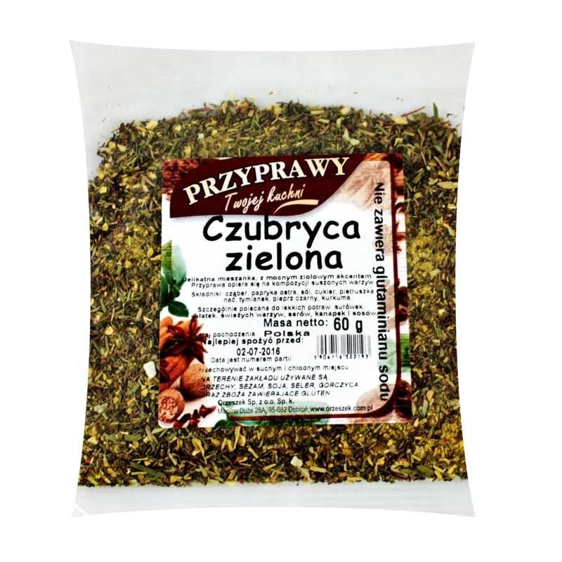 Skład: Cząber, papryka ostra, sól, cukier, pietruszka nać, tymianek, pieprz czarny, kurkuma.